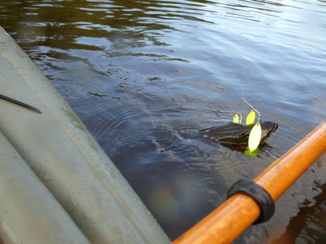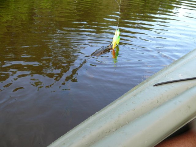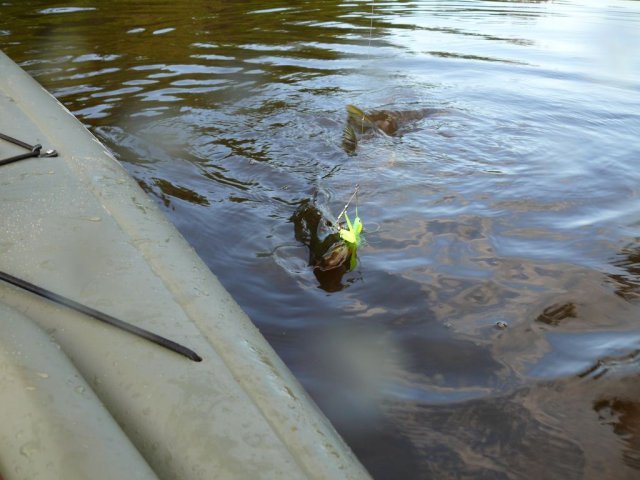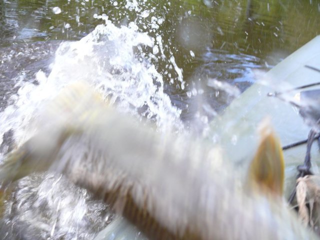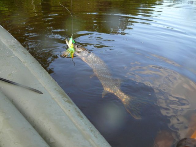 Je ferre et je me bats avec un brochet de 75 cm, il faisait la largeur du bateau. Assis sur l’eau, les sensations de combat sont excellente, On fait corps avec le bateau, le lancer, le poisson et je maîtrise bien vite le brochet et le ramène vers moi.