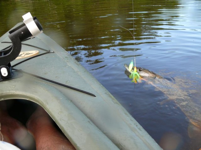 Lors de ma première sortie en kayak de pêche, je méditais en pensant qu’assis aussi bas sur l’eau et dans une embarcation si petite, un beau poisson au bout de la ligne devrait être sportif à retirer... Je fus tiré de mes pensées par une attaque de brochet assez violente.