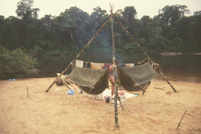 Curieux d’expérimenter cela, nous avons coupé trois solides perches mises en triangle sur l’île Massiriki et nous avons testé ce mode de bivouac plus facile à construire qu’un carbet. Il a l’avantage de pouvoir se mettre n’importe où, même sur un sol dur, d’être facile à bâtir. Avec des hamacs avec toit et moustiquaire comme les nôtres, il n’est pas évident à utiliser mais avec du hamac coton, c’est confortable. Par contre, en cas de pluie, mettre une bâche étanche, ce n’est pas évident....
