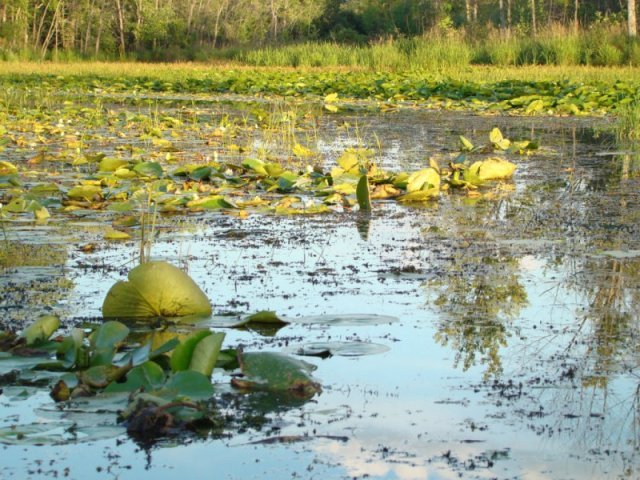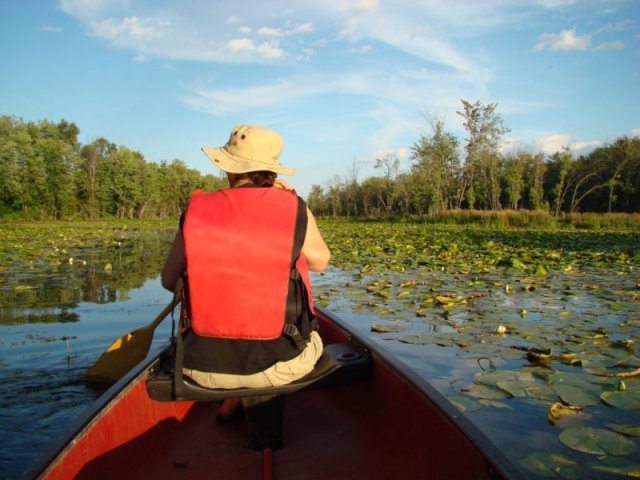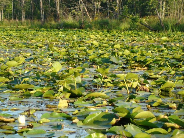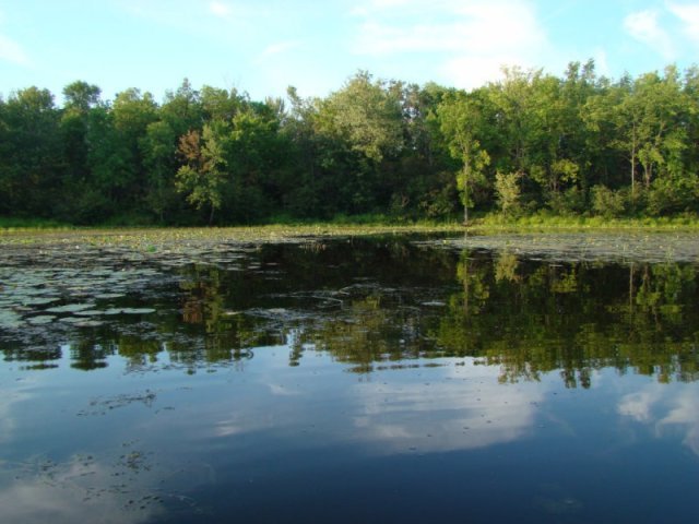 Les nénuphars sont particulièrement prospères. Ils poussent tellement densément que les feuilles s’élèvent au-dessus de l’eau pour trouver de la lumière tellement la concurrence est vive. Nous apercevons quelques ouaouarons et de temps un temps des bandes d’alevins qui fuient à notre approche. Des martins-pêcheurs pêchent sans arrêt.