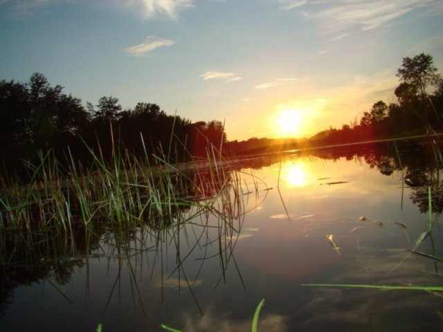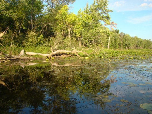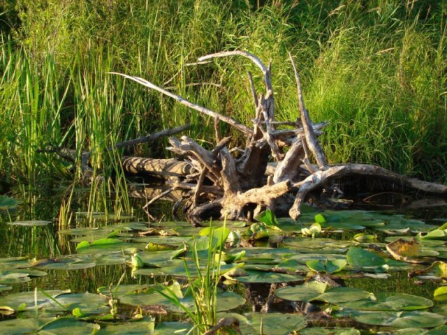 Ce ruisseau se transforme en grand marais abritant une faune et une flore d’une richesse remarquable. La végétation aquatique est dense et il nous faut naviguer dans le chenal principal. La richesse de la flore aquatique est une source d’émerveillement continuel. L’eau est très claire et je peux même observer des poissons. Alors que je longe une cabane de castor, un castor surgit et frappe l’eau violemment avec sa queue. Surpris et je sursaute. Plus j’avance, plus la rivière devient impénétrable et envahie par une végétation aquatique exubérante. Seul un tout petit chenal central permet de naviguer.