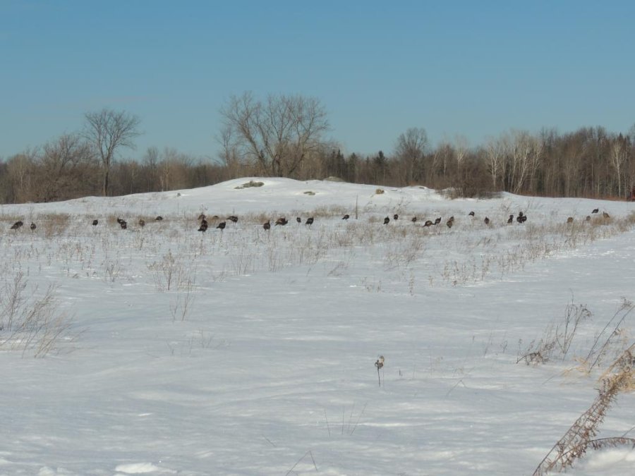 Comme il faisait beau, nous avons pris des petits chemins de campagne. On a tout d’abord croisé une bande de dindons sauvages de taille peu courante, ça fait longtemps que je n’en ai pas vu autant. j’en ai compté autour de 80 mais comme une partie de la troupe était de l’autre coté d’une petite butte, il devait y en avoir au moins une centaine.