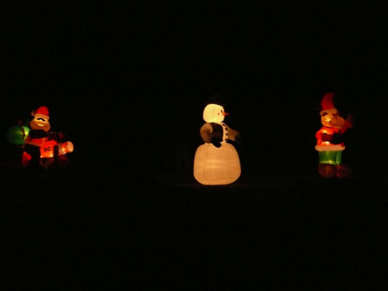 En plus des traditionnelles décorations lumineuses, des décorations gonflables de grande taille fleurissent un peu partout. Des bonhommes de neige, des pères Noël en moto nous saluent.