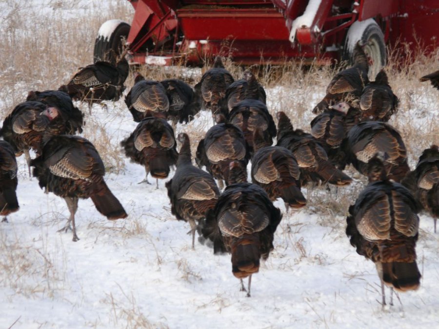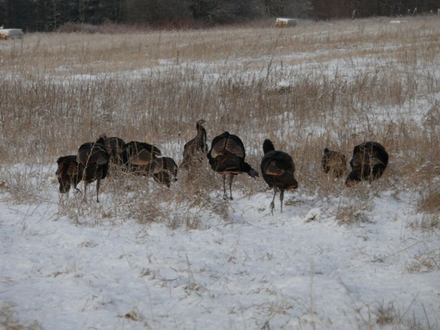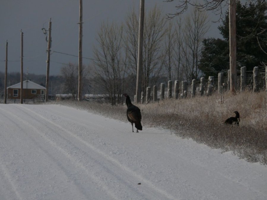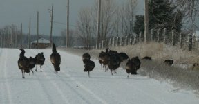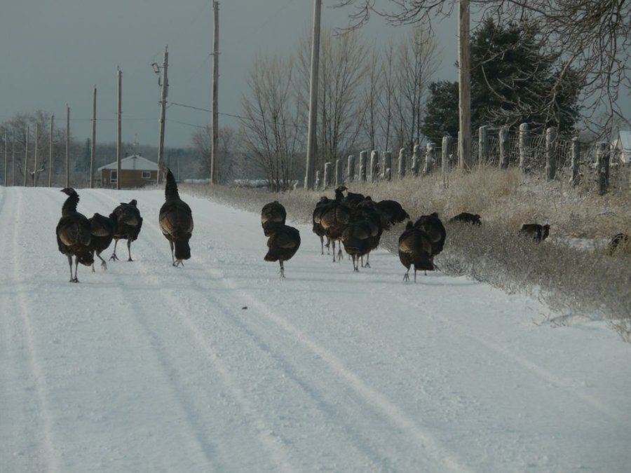 Un troupeau de dindon, au moins 35 individus, traverse la route devant moi, sans se presser.