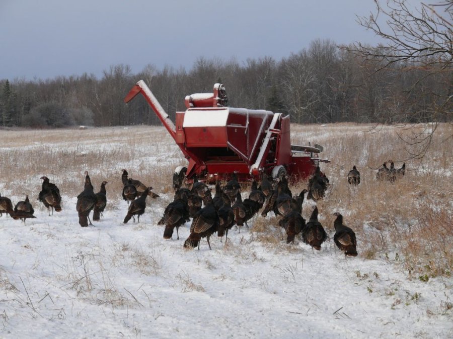 En rangs serrés, ils explorent et picorent, grattant la neige sans cesse.