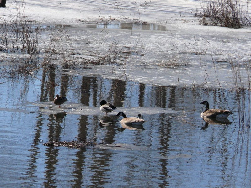 Le 25 mars, nous nous rendons à Pembroke. Au retour, nous voyons un grand héron ainsi que quelques oies et canards sur la rivière des Outaouais partiellement dégelée.