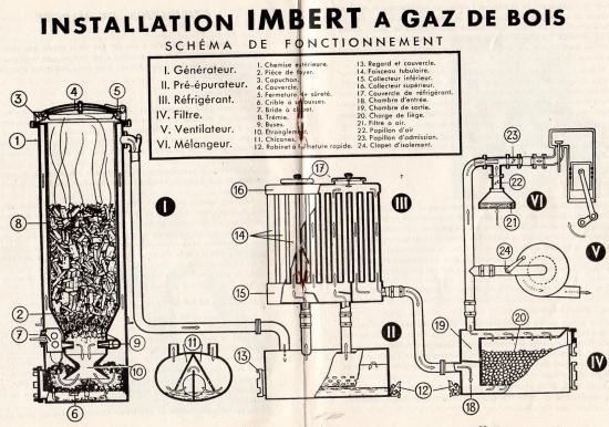 Ce système (sous la forme mise au point par Georges Imbert) fut utilisé couramment pour pallier l’absence de carburant automobile pendant la période de l’occupation allemande. C’est en effet un appareil simple à fabriquer, ne demandant que des matériaux faciles à se procurer.