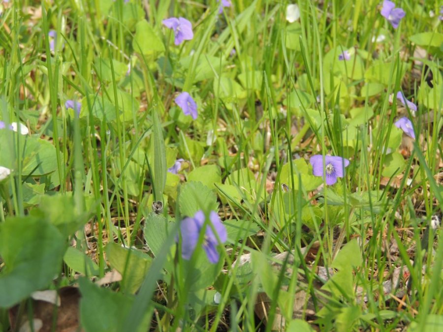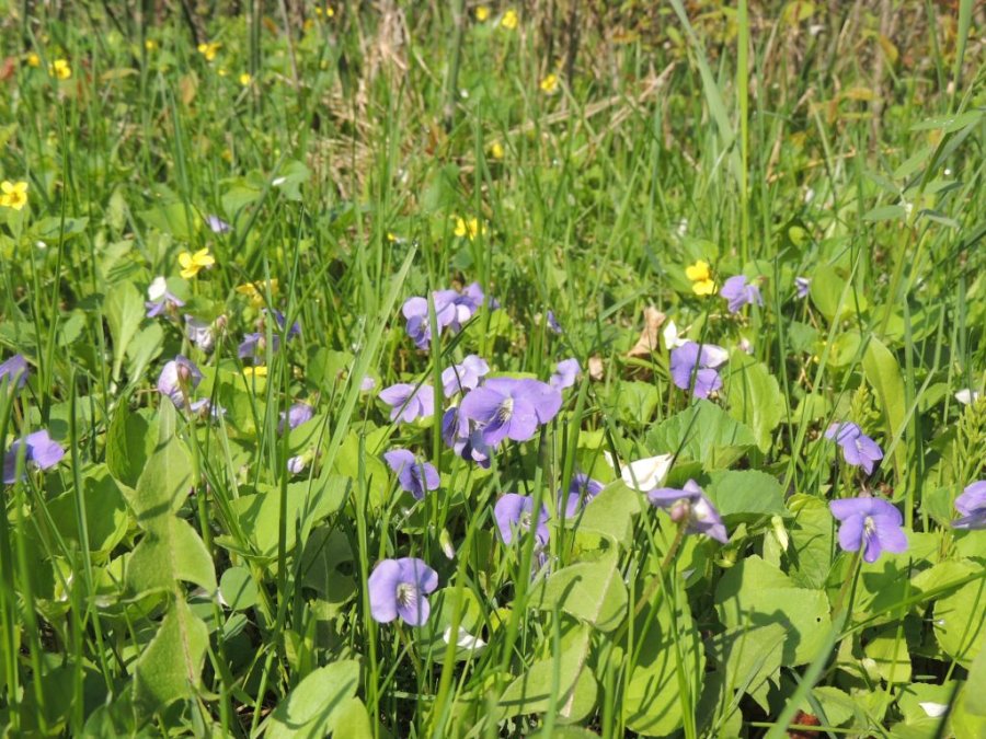 Je continue ma balade. Dans la forêt inondée, j’ai la surprise de voir des canards en grand nombre. Arrivée en prairies, les amélanchiers, les cerisiers sauvages sont en fleur. et le sol est couvert par endroit de violettes et de fleurs jaunes.