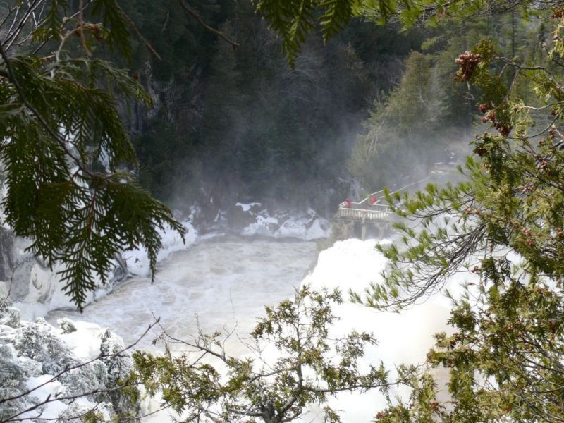 Du milieu de la passerelle, on aperçoit le belvédère qui est face à la grande chute.