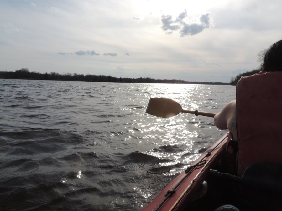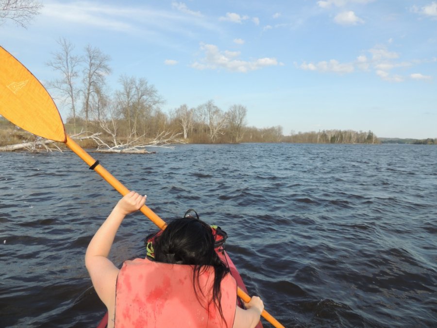 Le courant était fort, le vent également ! Nous avons descendu le petit rapide, presque inexistant en été au-dessus du quai. Ça a bougé fort. Une main invisible nous a secouée en tous sens en en bas du rapide, le kayak a fait une tête à queue imprévisible ! Je ne l’ai pas vu arrivé !