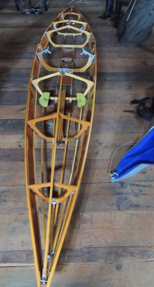 Ce printemps, nous avons acheté un Kayak pliant monoplace Klepper T9 prés de Toronto pour un prix très intéressant. Il est âgé mais en bon état. Le démontage a été difficile car il n’a pas été démonté depuis 10 ? 15 ? 20 Ans ? Le Klepper T 9 est un modèle de kayak pliant monoplace de légende ! À l’aise aussi bien en eau vive qu’en mer, il est agile, rapide, stable et peu être chargé à 220 kg. Il n’a pas les boudins gonflables des Klepper moderne. La coque est faite d’un tissu de lin ou de chanvre en raison de sa plus grande élasticité recouverte de caoutchouc naturel ou caoutchouc synthétique plus fragile et tenant moins dans le temps que les coques moderne en Hypalon plus résistant à la déchirure et au vieillissement. Le notre a ??? an et la coque est en assez bon état. Au cas ou la peau serait à changer, on peut en acheter des neuves en hypalon. longueur : 4,50 m Aujourd’hui, nous l’avons nettoyé et remonté.