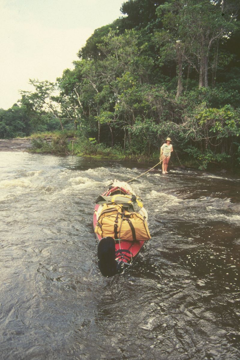 Voici un exemple de passage de saut à la cordelle en Amazonie. Momo tire le bateau à partir de la berge. Elle va ainsi tirer le kayak d’expédition jusqu’en amont des rapides.