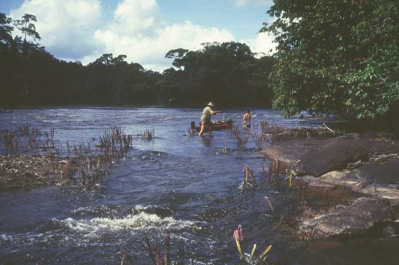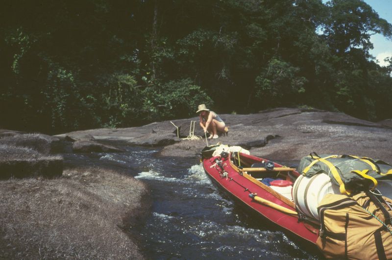 Le kayak d’expédition est lourdement chargé, le courant très fort. Le rapide est dangereux. Le seul endroit sécuritaire trouvé pour le franchir est un « bistouri », un petit canal naturel. Ce jour la , ça c’est mal passé. Les roches étaient glissantes, le courant était violent dans le bistouri qui s’élargissait par endroits. Le kayak s’est mis en travers, a entraîné Momo qui a été traînée sur des roches abrasives et il a redescendu le rapide, avec nous qui courrions derrière.... On a récupéré le kayak. Tout le chargement était bien attaché, on n’a rien perdu.